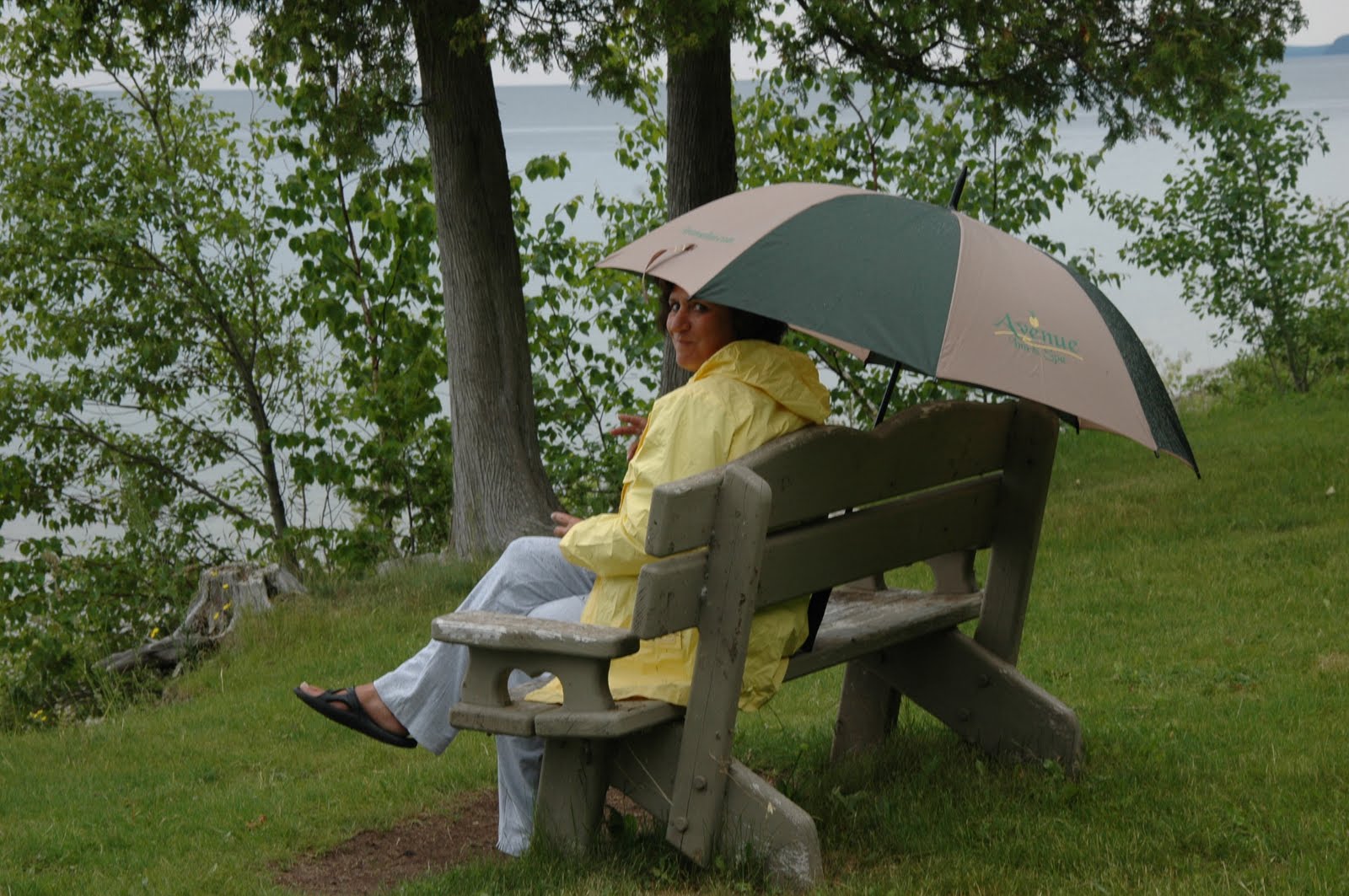 We manage to finish our hikes just before the raindrops begin and still are determined to have our picnic. The perfect spot is discovered and we enjoy immensely (that's why we have umbrellas)!